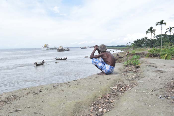 बांग्लादेश के लक्ष्मीपुर ज़िले के लुधुआ गाँव का एक दृश्य, जिसमें चक्रवात में अपना सबकुछ खो चुके एक बुजुर्ग चिंतामग्न बैठे हुए हैं। फोटो क्रेडिट: रफ़ीकुल इस्लाम मोंटू।