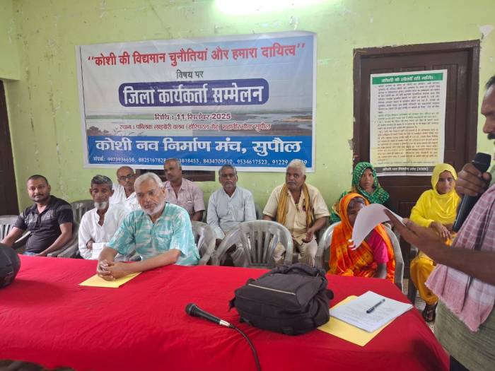सुपौल: कोशी नदी और उसके मैदान में स्थित भूभाग की चुनौतियों और स्थानीय समाज व लोगों के दायित्व पर केंद्रित कोशी नव निर्माण मंच का कार्यकर्ता सम्मेलन 11 सितंबर 2025, दिन गुरुवार को सुपौल शहर की पब्लिक लाइब्रेरी में आयोजित किया गया। इस सम्मलेन में बारिश के इन दिनों में उफनाई हुई नदी और पानी की धारा को पार करते हुए दो दर्जन से अधिक गांवों के करीब ढाई सौ कार्यकर्ताओं ने हिस्सा लिया। आयोजन के दौरान वक्ताओं व प्रतिभागियों ने कोशी के के सवालों पर सरकार व प्रशासन पर उपेक्षा का आरोप लगाया। बह हुई वर्षा के बावजूद दो दर्जन से अधिक गांवों के ढाई सौ कार्यकर्ता शमिल हुए। सभी ने कोशी के सवालों पर सरकार और प्रशासन की उपेक्षा लगाया।
