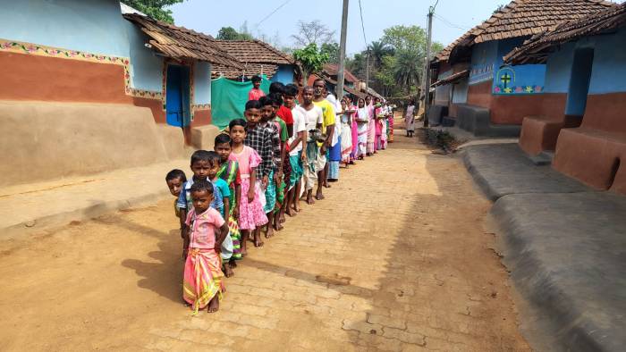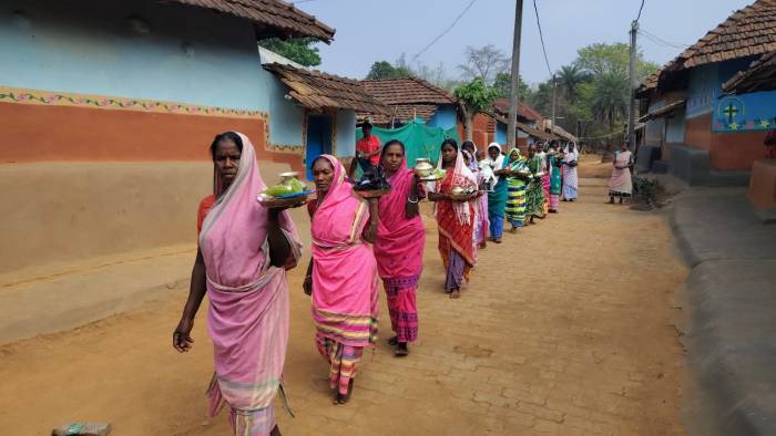 पूजा स्थल मंझी थान की ओर जाते बच्चे और वयस्क।
