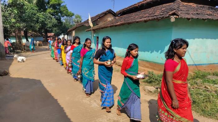 पूजा की तैयारी में संताल युवतियां।