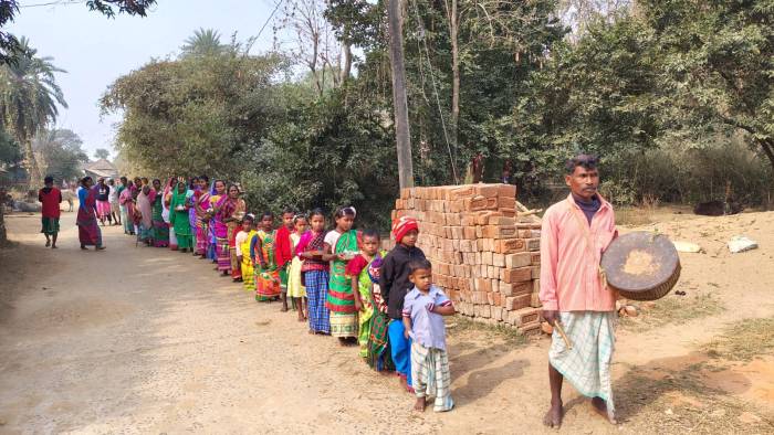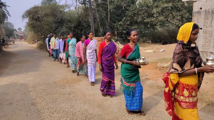 पूजा से जुड़ी एक रस्म में शामिल संताल महिलाएं।